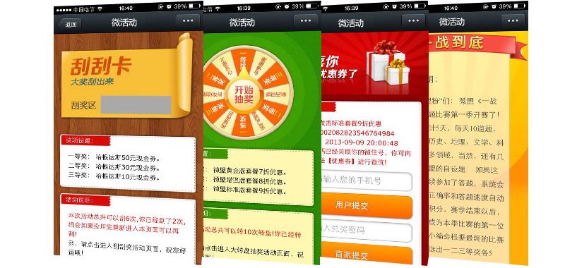 我们将利用微信的强交互性,让您通过对互动流程、环节和方式的设计,包括优惠券推广模块、幸运大转盘推广模块、刮刮卡抽奖模块、微投票、一战到底等功能模块,商家通过发起营销活动,对已有客户进行再营销。